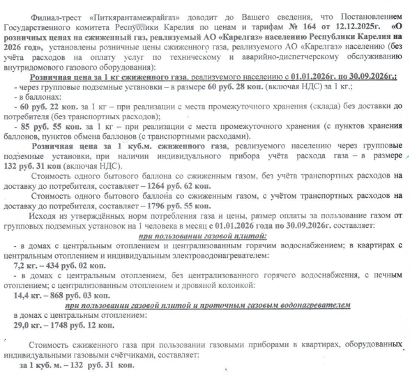 Изменение цены на газ с 01.01.2026г.